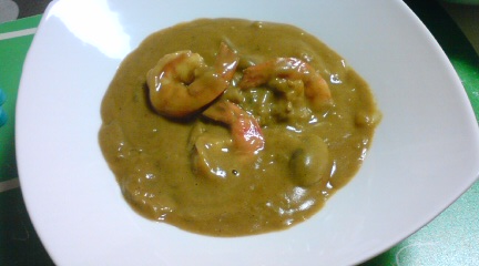 (7)煮立ったら、分量の生クリームを入れ、取り置いておいたえびを入れ沸々するまで少し混ぜます。